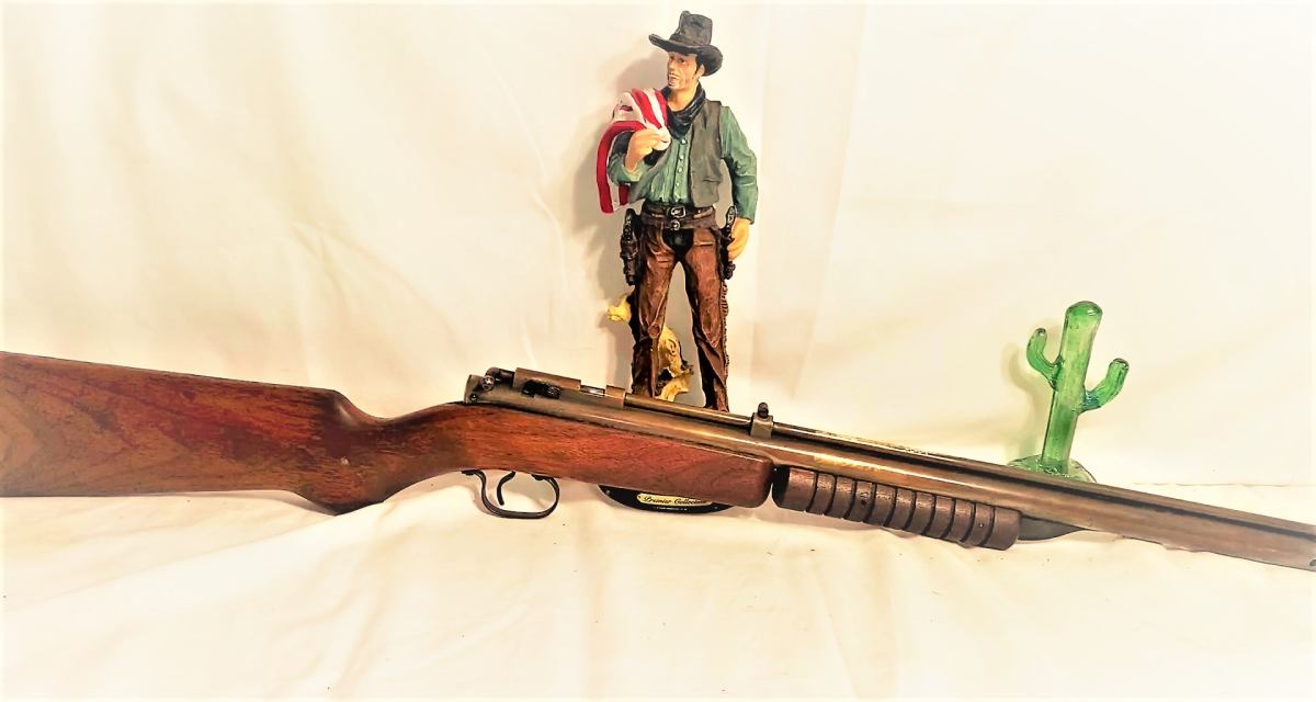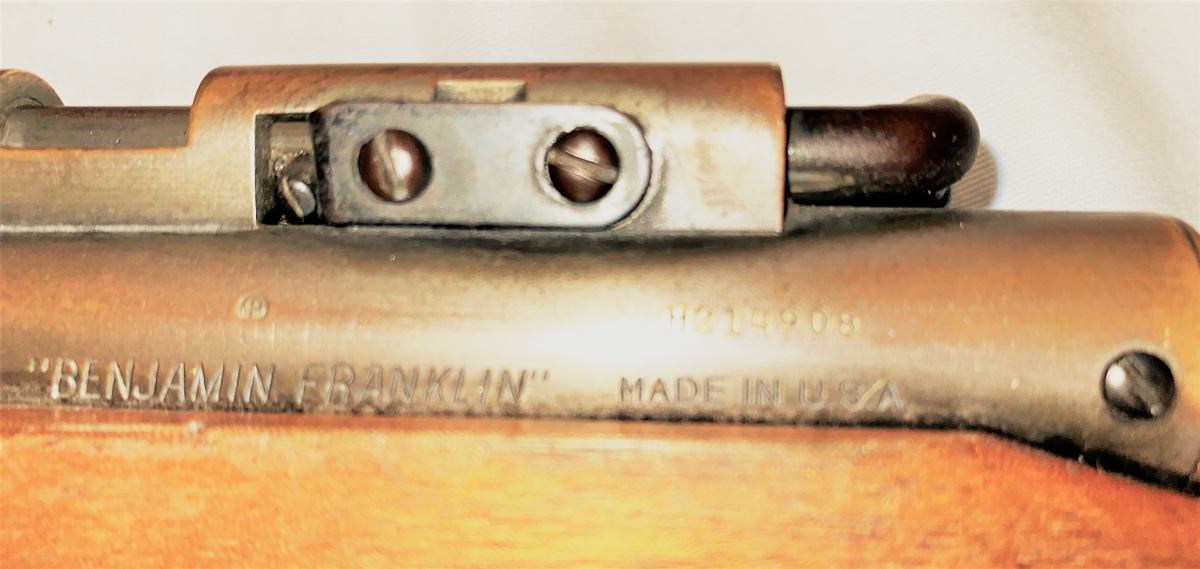THIS BENJAMIN FRANKLIN MODEL 310 IS 177 CALIBER PELLET , SMOOTH BORE , SINGLE SHOT , BREACH LOADING , PUMP UP PNEUMATIC WITH SWINGING PUMP HANDLE . VERY POWERFUL AFTER 3 PUMPS . THIS GUN HAS BEEN NEWLY RESEALED . BLACK NICKEL FINISH ALL BUT GONE MOSTLY ALL BRASS SHOWING . WALNUT STOCK & FOREGRIP IN GOOD CONDITION . MANUFACTURED IN NEW YORK FROM 1940 THRU 1960’S . I BELEIVE THIS ONE IS FROM AROUND 1955 . VERY COLLECTIBLE VERY NICE GUN . THE SHIPPING ON THIS GUN WOULD BE $30 IN THE LOWER 48 .