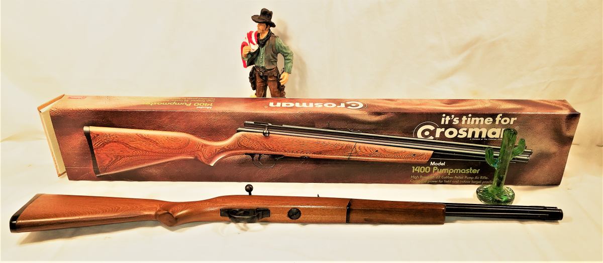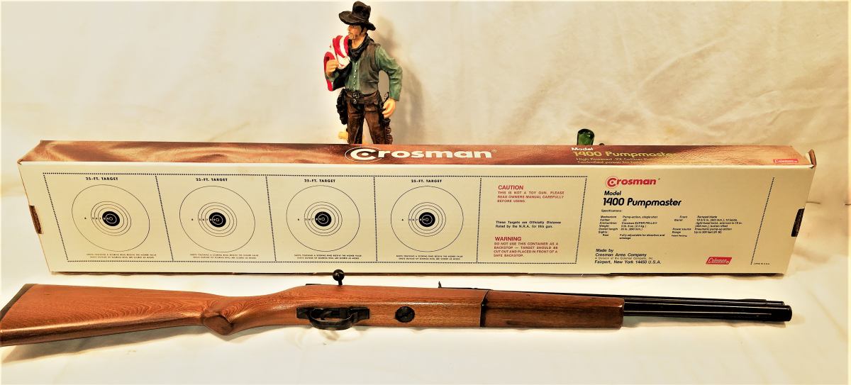THIS CROSMAN MODEL 1400 PUMP MASTER 22 CALIBER MULTIPUMP PNEUMATIC , IS A SINGLE SHOT PELLET CAN BE PUMPED 10 TIMES REACHING CLOSE TO 600 FPS WEIGHS 51/2 LBS HAS A SLIM LINE WOOD STOCK AND FOREARM . COMES WITH LIKE NEW BOX . THIS GUN WAS PRODUCED FOR ONLY FIVE YEARS 1973 THRU 1978 . THIS GUN SHOWS VERY LITTLE USE IT IS RIGHT AT 100 % . THIS IS A GREAT LITTLE RIFLE FOR GAME , TARGETS OR PERSONAL PROTECTION . WILL COME WITH SOME PELLETS . THE SHIPPING ON THIS PELLET GUN WOULD BE $20 IN THE LOWER 48 .