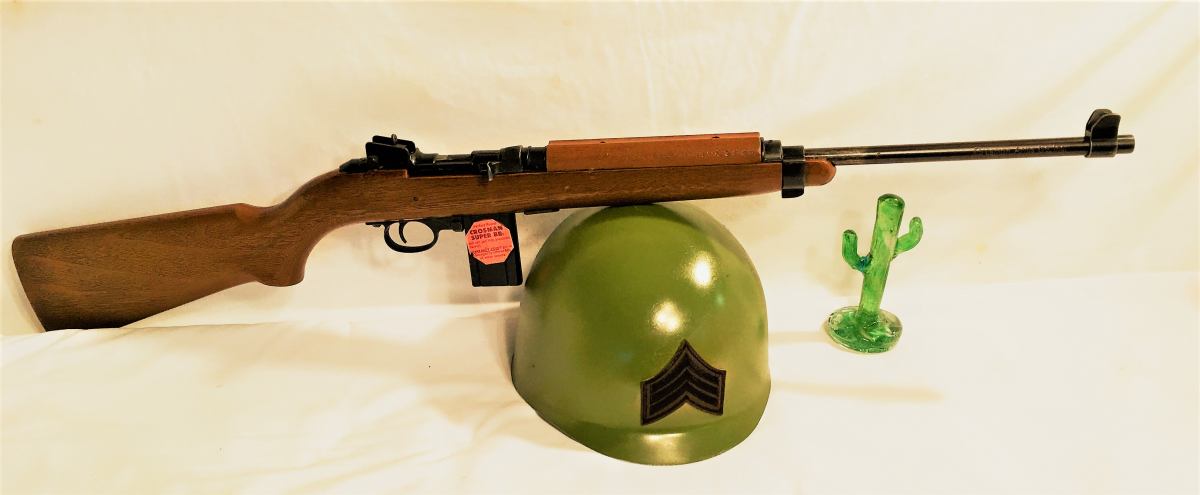 THIS CROSMAN M-1 CARBINE IS A PUSH BARREL SMOOTH BORE , 177 CALIBER , 22 SHOT GRAVITY FED MAGAZINE, 180 ROUND RESERVOIR ORIGINAL CLIP , 2ND VARIANT , CROSWOOD STOCK DARK BROWN . PRODUCED IN 1968 THRU 1976 IN BLOOMVILLE NY . VERY NICE GUN SHOOTS VERY STRONGĀ AND COLLECTIBLE . THE SHIPPING ON THIS GUN WOULD BE $25 IN THE LOWER 48