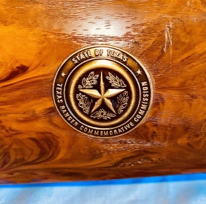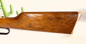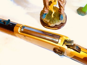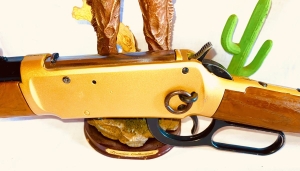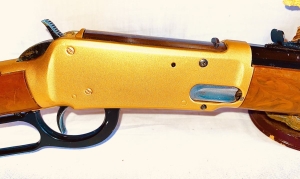 What makes this gun a custom the frame is from a late 1894 hex barrels that Daisy produced. The top of the receivers have been polished to a bright silver and clear coated. The receivers, butt plate, fore grip cup have been painted gold and clear coated. The only gold receiver guns that Daisy produced was for Sears exclusively. This is not a Sears gun . It has a Texas ranger badge medallion on the stock that has been added for no reason only to look good . This gun has some playtime shoots strong all the gold paint is new . Nice gun probably won’t see another one like it . The shipping on this gun would be $30