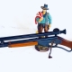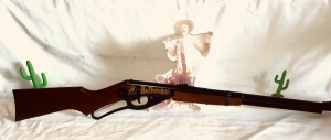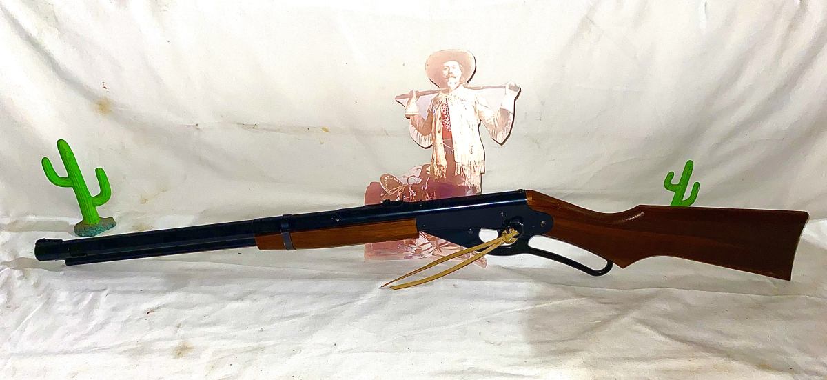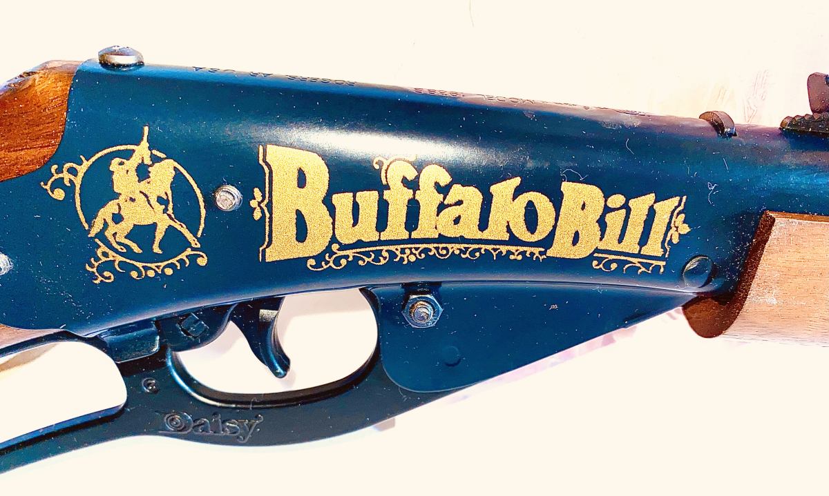 This Daisy Buffalo Bill was produced in Rogers Arkansas in 1980 as an export model . It has a red ryder shaped stock with no brand looks to be walnut along with the foregrip . Gold stencil of Buffalo Bill on horseback in bold letters saying Buffalo Bill . The export models of the red ryder type came in a red ryder box turned inside out . This one has that type of box in perfect condition. Collectible. The shipping on this gun would be $35 .