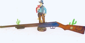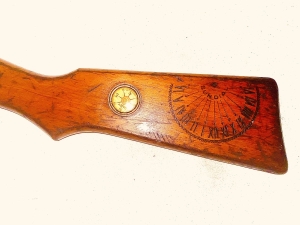 This gun does show some playtime it is a barn find has about 70percent of blueing I can’t see any cracks in the stock but it does show wear has a good compass no needle has a plate that rotates smoothly. This is a trombone action gun . I have seen many of these guns without a shot tube this is the only gun Daisy made that takes a special shot tube as far as I know. Rare find . Shoots strong collectible . The shipping on this gun would be $35
