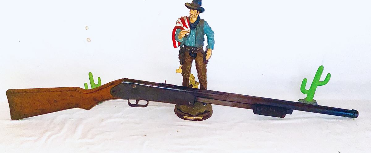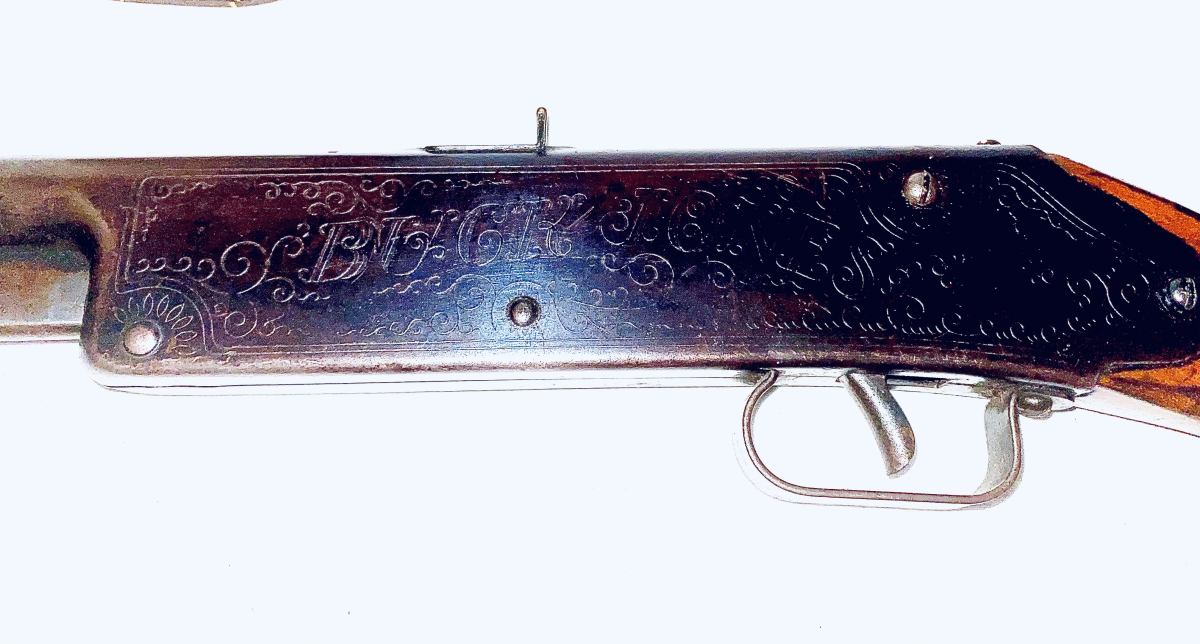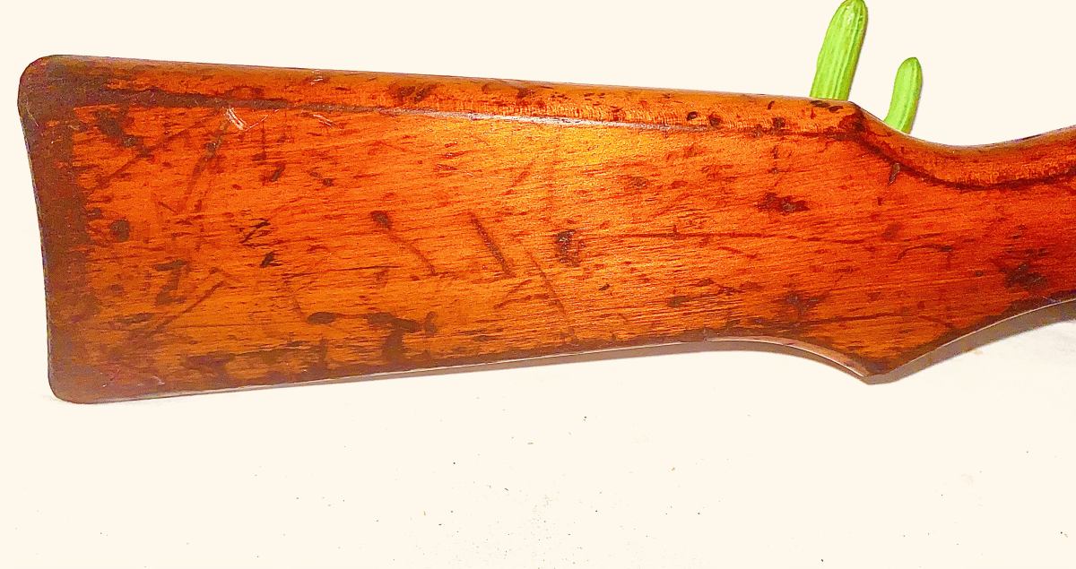 This gun does show some playtime it is a barn find has about 70percent of blueing I can’t see any cracks in the stock but it does show wear has a good compass no needle has a plate that rotates smoothly. This is a trombone action gun . I have seen many of these guns without a shot tube this is the only gun Daisy made that takes a special shot tube as far as I know. Rare find . Shoots strong collectible . The shipping on this gun would be $35