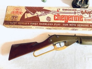 This Daisy Cheyenne pop gun shows playtime but not abuse. We cleaned , oiled, and adjusted the ricochet unit so it would have a good clear sound. The box has good colorful graphics on the front on the edges and back of box . The inflaps one has been tattered and glued shut the other end had been partially replaced but opens and closes good . These guns are very rare to find in good condition.These were produced from the the tv series Cheyenne which featured Clint walker which aired on tv in the mid to late fifties and into the sixties produced in Roger Arkansas either in 1958 or shortly after . Collectible in this condition with the box .The shipping on this gun would be $35