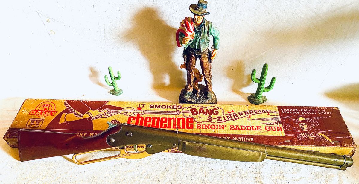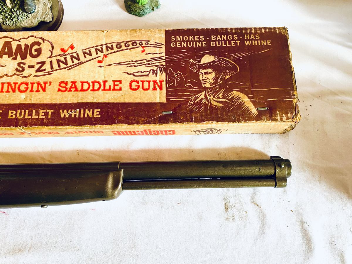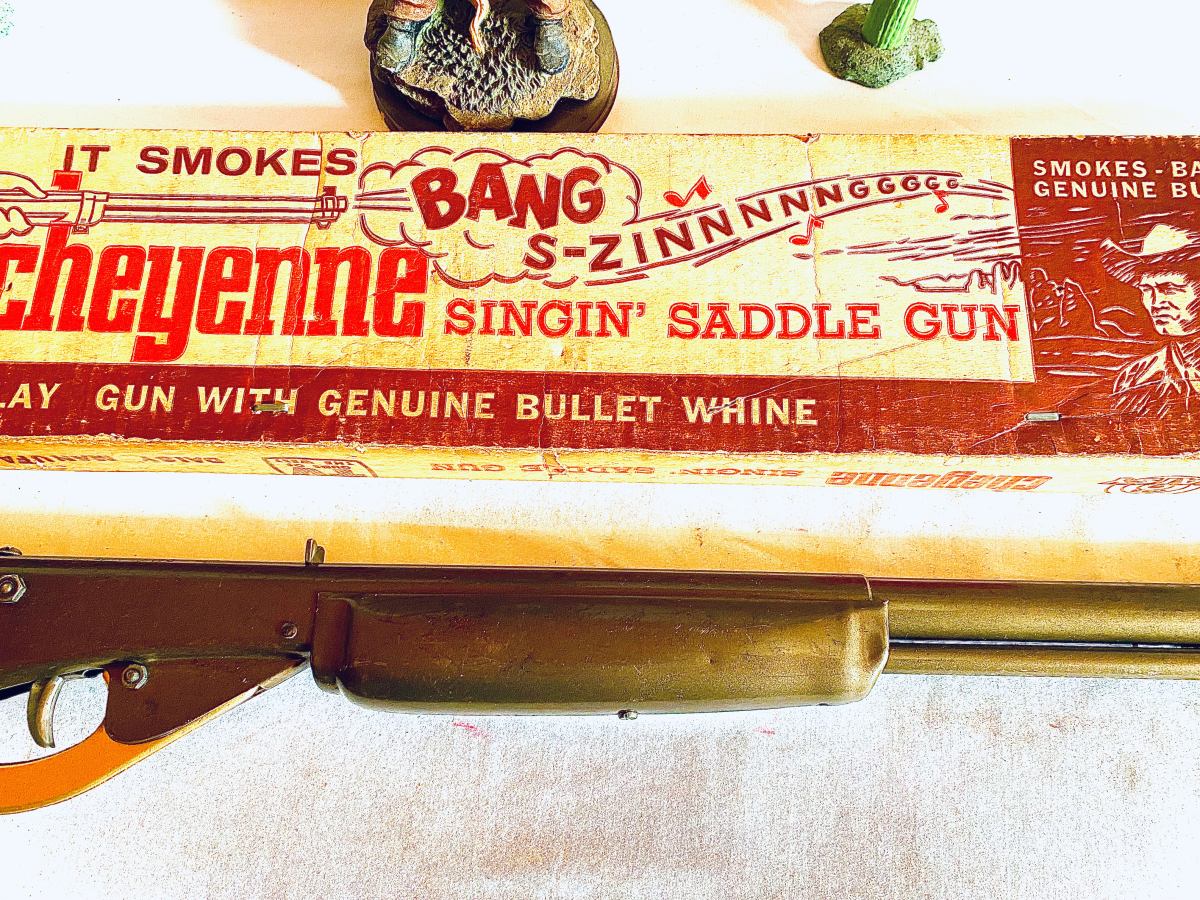 This Daisy Cheyenne pop gun shows playtime but not abuse. We cleaned , oiled, and adjusted the ricochet unit so it would have a good clear sound. The box has good colorful graphics on the front on the edges and back of box . The inflaps one has been tattered and glued shut the other end had been partially replaced but opens and closes good . These guns are very rare to find in good condition.These were produced from the the tv series Cheyenne which featured Clint walker which aired on tv in the mid to late fifties and into the sixties produced in Roger Arkansas either in 1958 or shortly after . Collectible in this condition with the box .The shipping on this gun would be $35
