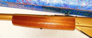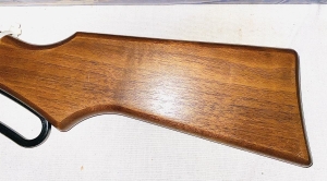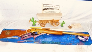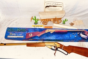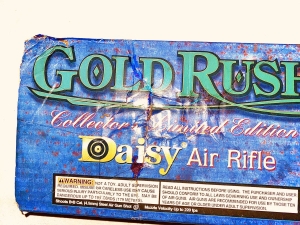 This Daisy Commemorative 49ers rifle was produced for one year in 1999 twenty five years ago in Rogers Arkansas . It is number 261 of 2500 relatively low numbers . It is 177 caliber bb 325 fps . Smooth bore , steel barrel holds 700 bb’s . Blade and ramp front site adjustable open rear site . Stained hardwood stock , gold medallion on stock of gold miner . Laser engraved . Count number and quantity produced on right side of foregrip . Comes with all paper work , canvas bag and painted gold nuggets as pictured . The box has had some damage apparently stepped on by accident . We glued & repaired it the best we could . Box is not perfect but good . The gun looks brand new . Christmas is coming very collectible .The shipping on this would be $35