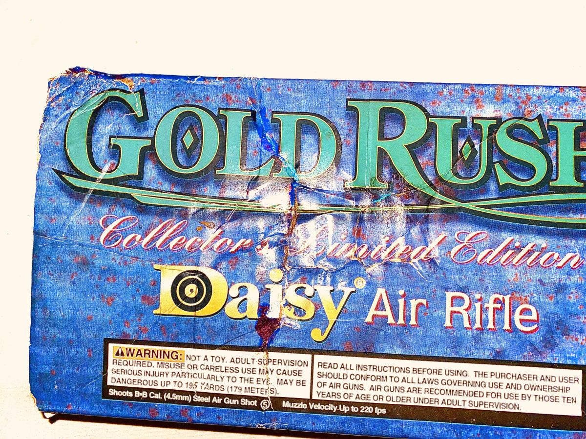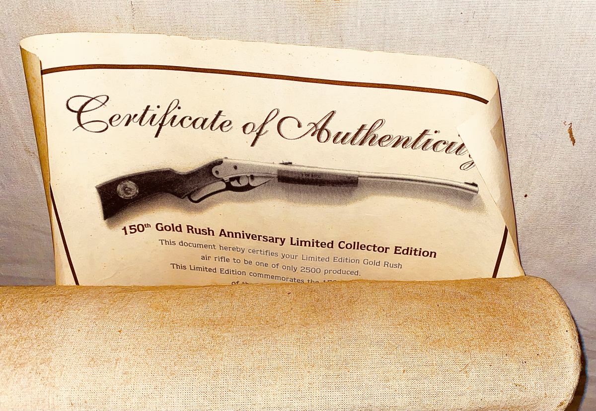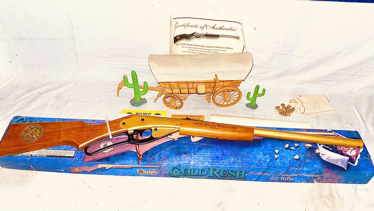 This Daisy Commemorative 49ers rifle was produced for one year in 1999 twenty five years ago in Rogers Arkansas . It is number 261 of 2500 relatively low numbers . It is 177 caliber bb 325 fps . Smooth bore , steel barrel holds 700 bb’s . Blade and ramp front site adjustable open rear site . Stained hardwood stock , gold medallion on stock of gold miner . Laser engraved . Count number and quantity produced on right side of foregrip . Comes with all paper work , canvas bag and painted gold nuggets as pictured . The box has had some damage apparently stepped on by accident . We glued & repaired it the best we could . Box is not perfect but good . The gun looks brand new . Christmas is coming very collectible .The shipping on this would be $35