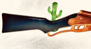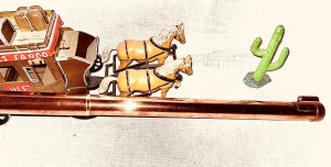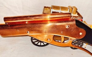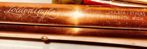 The Daisy model 50 golden eagle BB gun commemorates the 50 th anniversary of Daisy , copper plated model similar to the no. 195 buzz Barton . The Only copper plated gun they ever produced was the model 50 . Pistol grip stock , curved lever easily identified by the black painted stock with red white and blue federal eagle decal has been clear coated over apparently to protect the decal on the stock that’s my story and I’am sticking to it . Hooded Front site mfg. in Plymouth Michigan for two years 1936 and 1938 very scarce . This gun has been resealed and shoots strong. The shipping on this gun would be $25