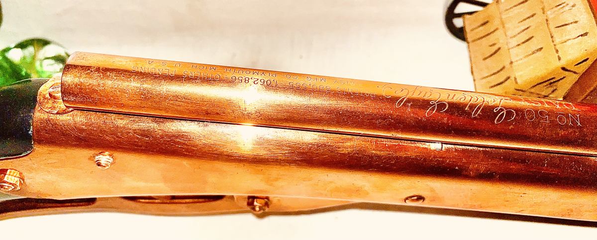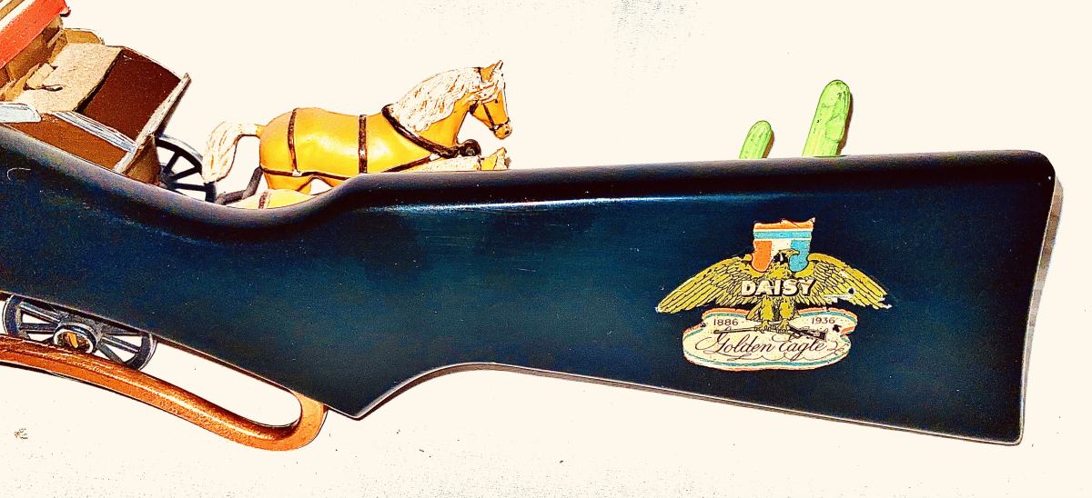 The Daisy model 50 golden eagle BB gun commemorates the 50 th anniversary of Daisy , copper plated model similar to the no. 195 buzz Barton . The Only copper plated gun they ever produced was the model 50 . Pistol grip stock , curved lever easily identified by the black painted stock with red white and blue federal eagle decal has been clear coated over apparently to protect the decal on the stock that’s my story and I’am sticking to it . Hooded Front site mfg. in Plymouth Michigan for two years 1936 and 1938 very scarce . This gun has been resealed and shoots strong. The shipping on this gun would be $25