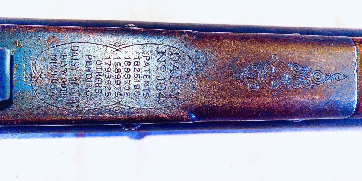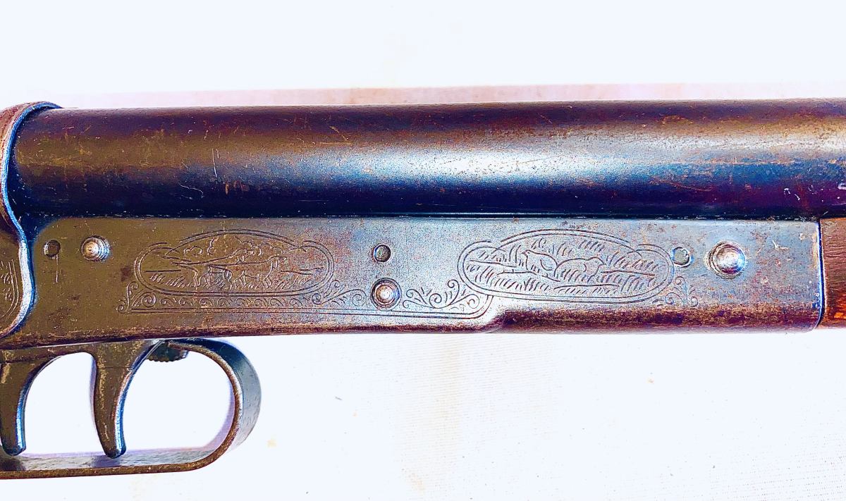 This is a Daisy model 104 double barrel produced in Plymouth Michigan 1938 thru 1940 . This one was produced the first day or two of production it has no safety window in the left side receiver. It is marked safety on the small push bar . This gun is in good condition nice stock and forearm walnut wood stamped design of game birds , dogs & scrolls . These guns with no safety windows are very rare look at all pictures. Shoots strong . The shipping on this gun would be $50