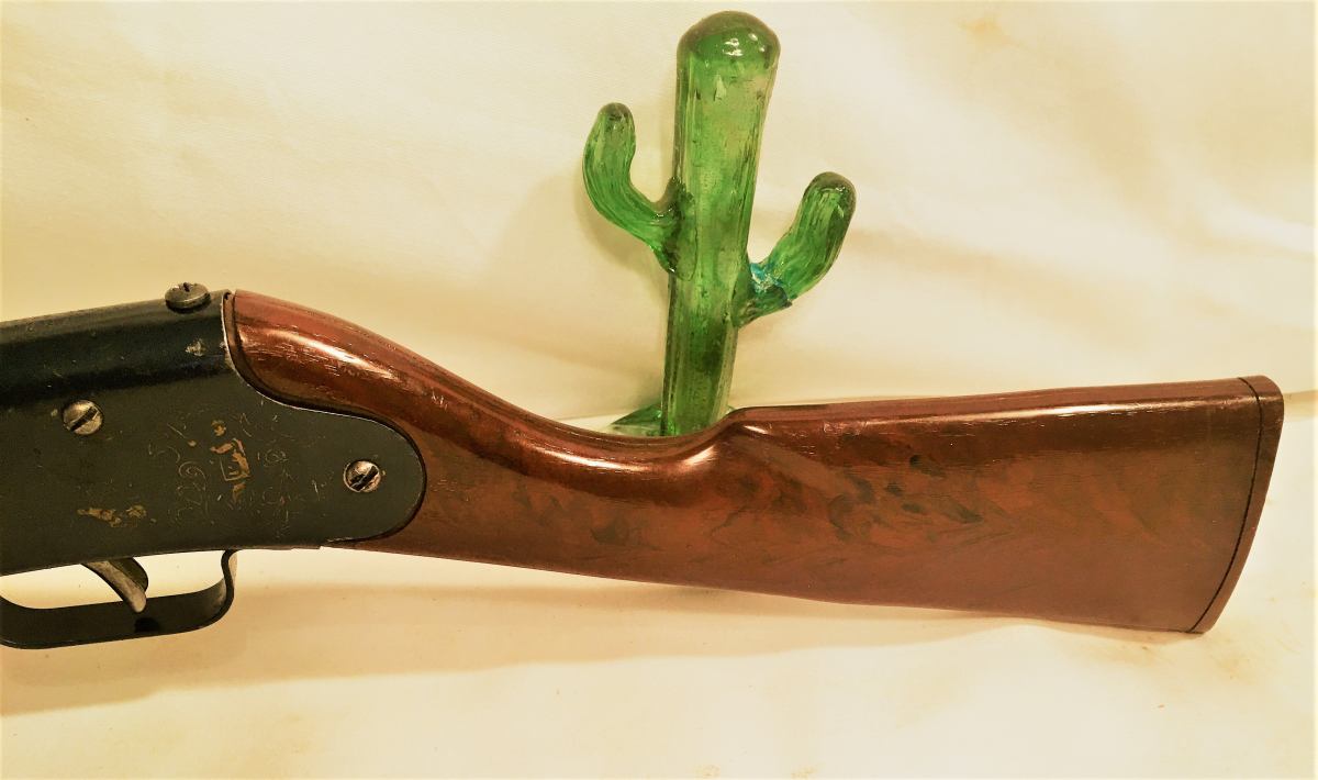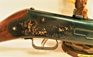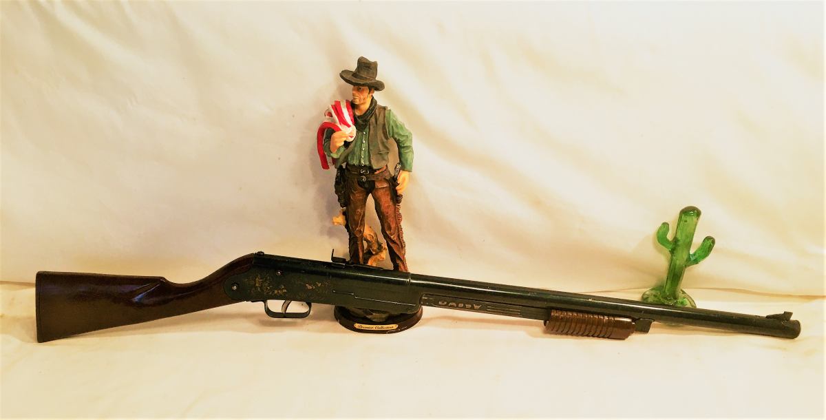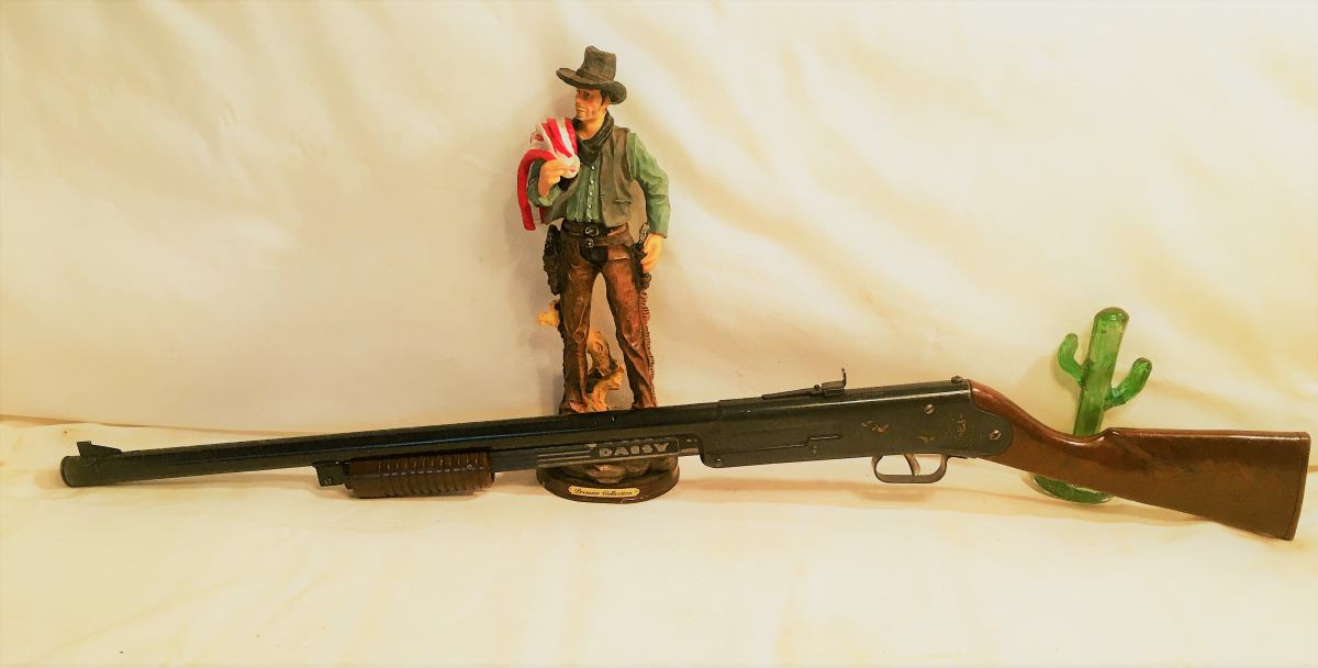 THIS DAISY MODEL 107 DOESN’T SHOW MUCH PLAYTIME STILL ALL ORIGINAL WITH DECENT GRAPHICS PHEASANT HUNTER AND DOG . THIS HAS THE COMPOSITE STOCK WITH 500 SHOT SHOOTS STRONG PRODUCED IN 1959 THRU 1962 IN ROGERS ARKANSAS . THIS ONE WAS PAINTED AT THE FACTORY THE DARK BLUE WITH ONLY A FEW SCRATCHES . VERY NICE GUN AND COLLECTIBLE . THE SHIPPING ON THIS GUN WOULD BE $15 IN THE LOWER 48 STATES