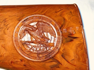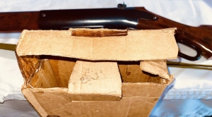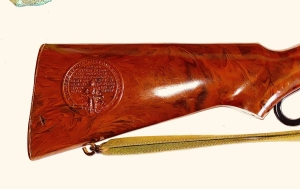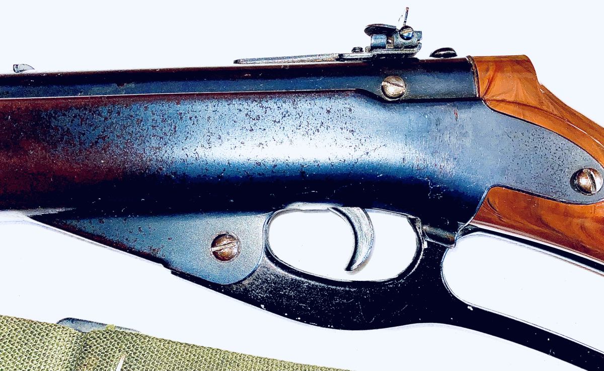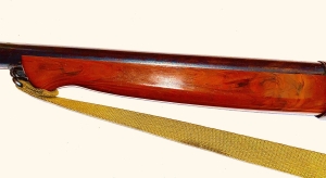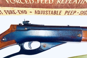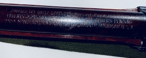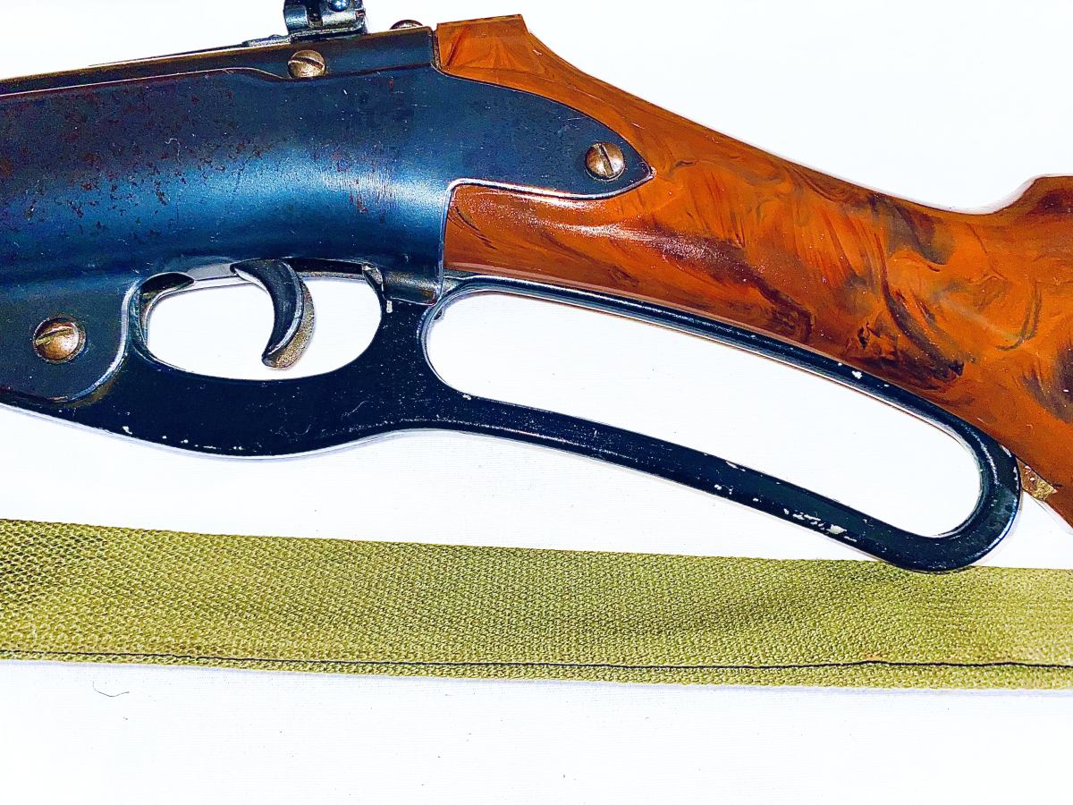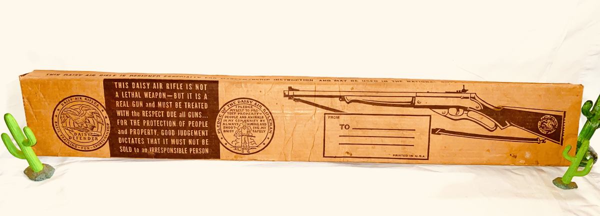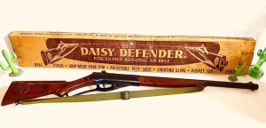 This Daisy Korean War defender was produced in Plymouth Michigan in 1951 & 1952 with blued finish. Plastic stock & foregrip , sliding door in butt plate for storage, 50 shot spring fed magazine shot tube and a clean original web sling it shows no wear at all .It comes with original box in good condition some repair. The blue finish on this gun is exceptionally nice for a gun that is 73 years old very little playtime on this gun . Very strong power spring . Shoots strong very collectible . The shipping on this gun would be $35 .