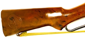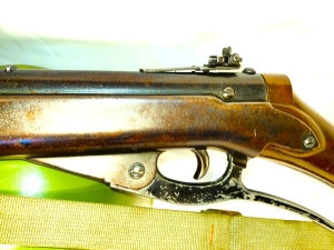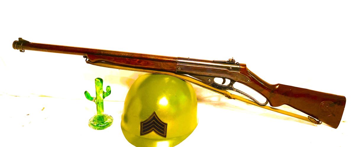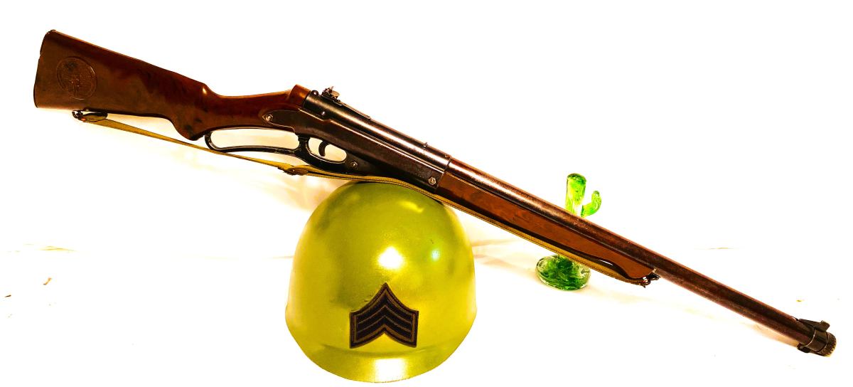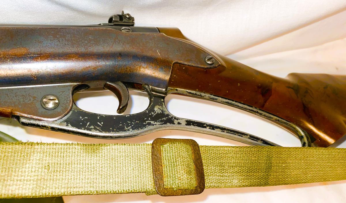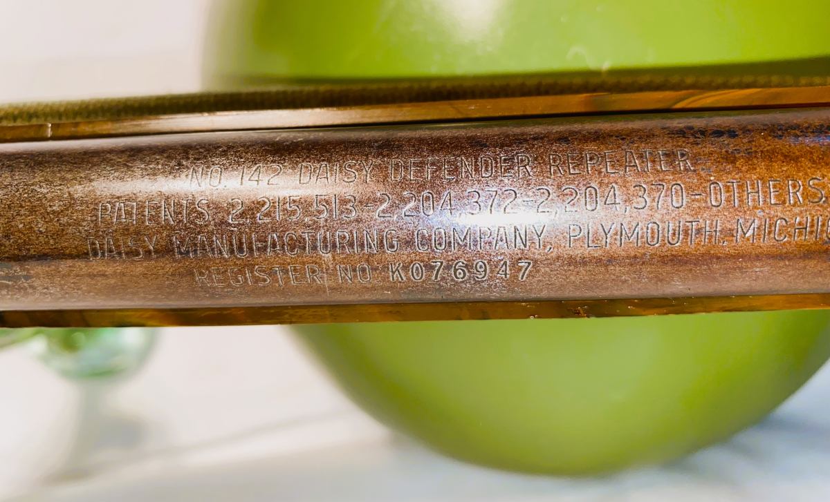 THE DAISY MODEL 142 DEFENDER WAS PRODUCED FROM 1953 THRU 1955 IN PLYMOUTH MICHIGAN . THIS IS A 100 SHOT GRAVITY FED , MOLDED STOCK AND FOREARM , BB STORAGE IN BUTT PLATE . THIS GUN CAME FROM THE FACTORY WITH BLUED FINISH FOR THE FIRST 6 MONTHS OF 1953 THE GUNS WHERE BLUED AFTER THAT THEY STARTED PAINTING THEM . THIS ONE IS FROM THE FIRST BUNCH PRODUCED IN 1953 . NOT MUCH BLUING LEFT ON THE GUN NO RUST JUST BROWN PATINA . GUN HAS BEEN SERVICED AND SHOOTS STRONG .COMES WITH THE ORIGINAL SLING IN GOOD CONDITION . NICE COLLECTIBLE