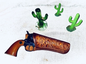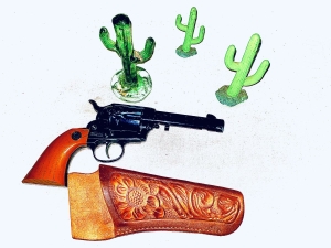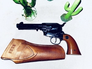 This Daisy model 179 peace maker revolver is 177 caliber , spring catapult action , 12 shot tubular spring fed magazine. Produced in Rogers Arkansas for approximately 25 years. As you can see this pistol has had some playtime but not abused . Has a nice tooled leather holster not made by Daisy. The shipping on this gun would be $25