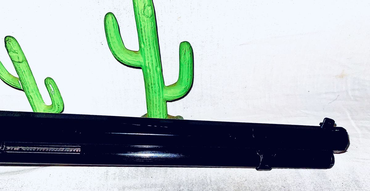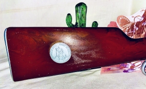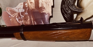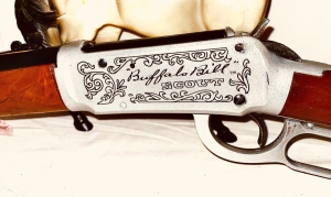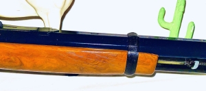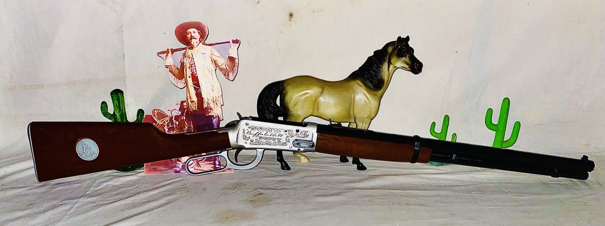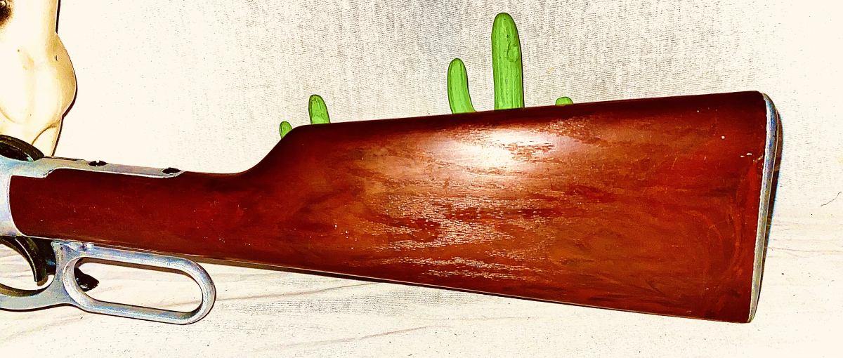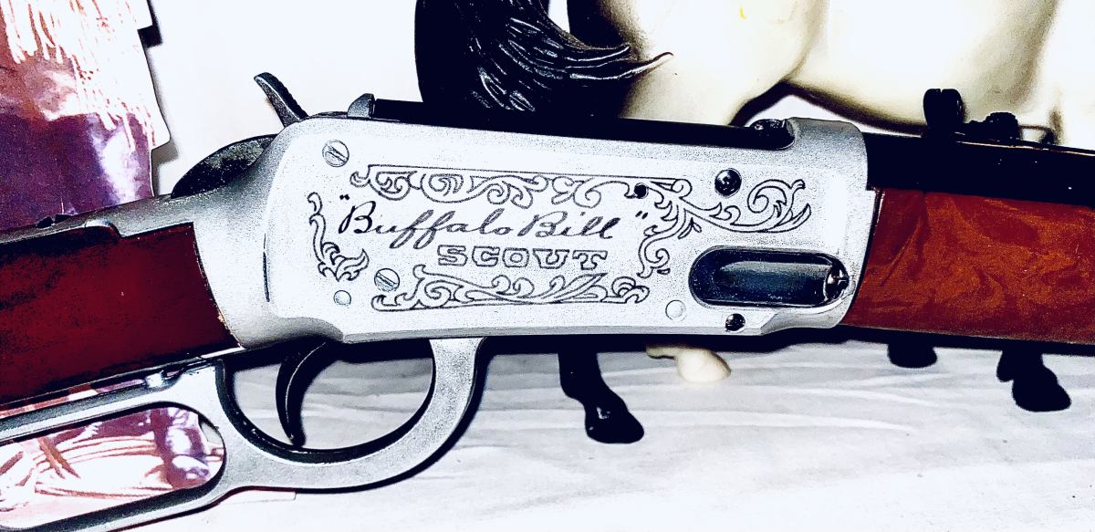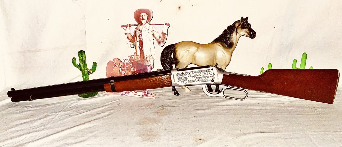 This is a custom 1894 Buffalo Bill this gun was never produced by Daisy. We have taken Daisy parts such as the later 1894 hex barrel parts and married them to a older set of 1894 receivers with out raised letters on them and no safety switch and no saddle ring along with all new parts inside and put this gun together for the person who would like to have something different than the round barrel Buffalo Bills . Nice gun shoots hard . The shipping on this gun would be $30