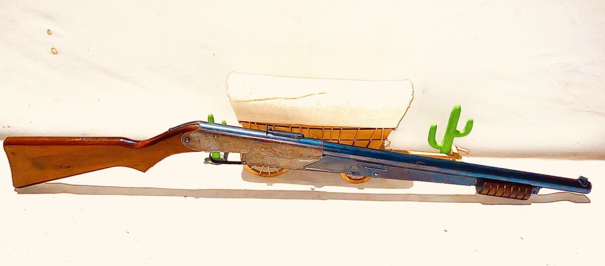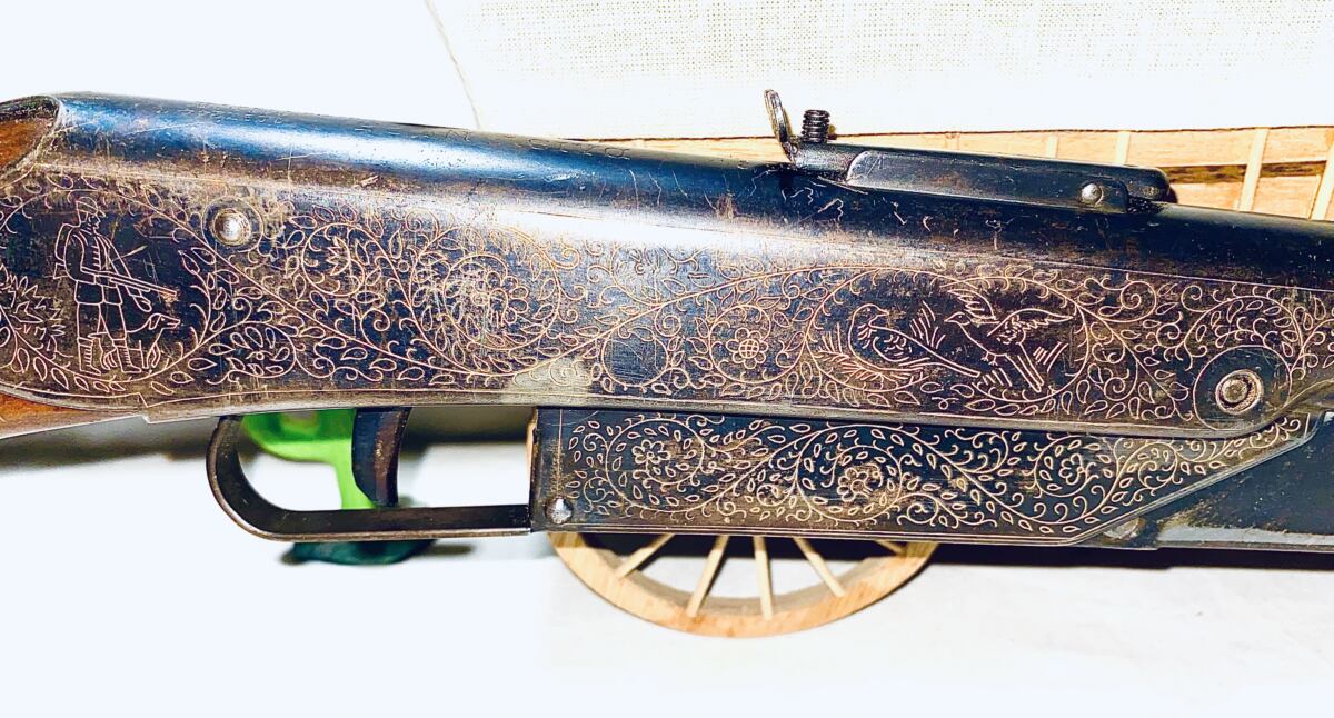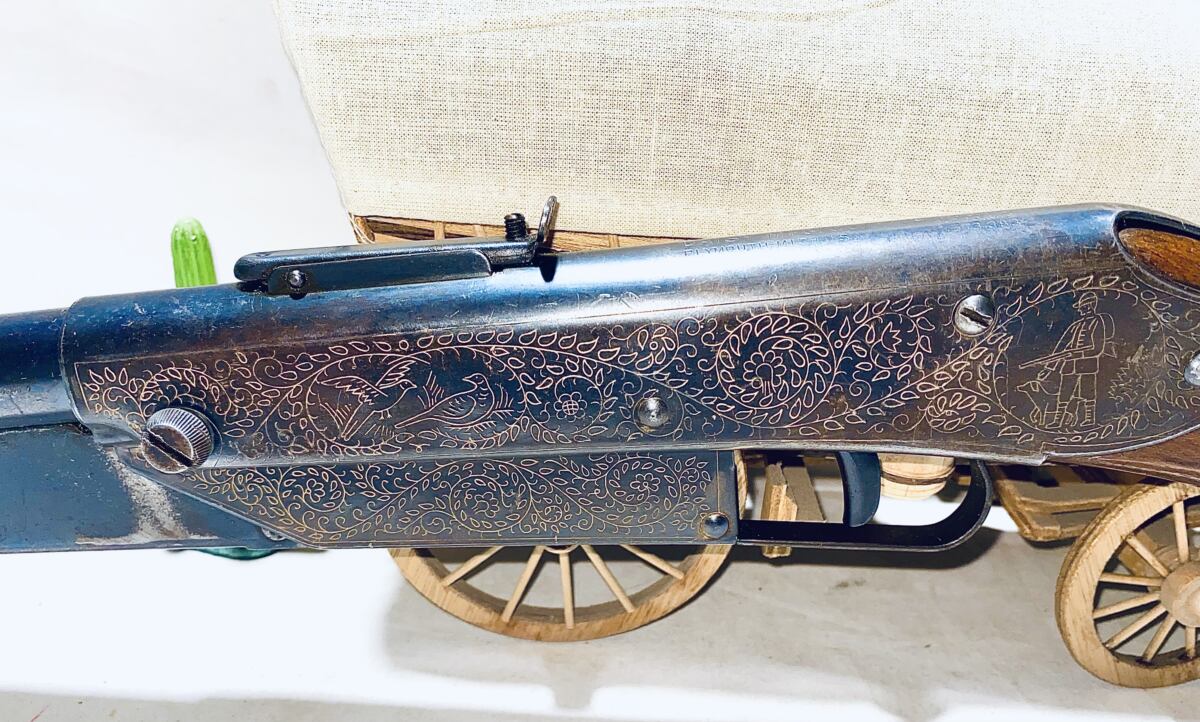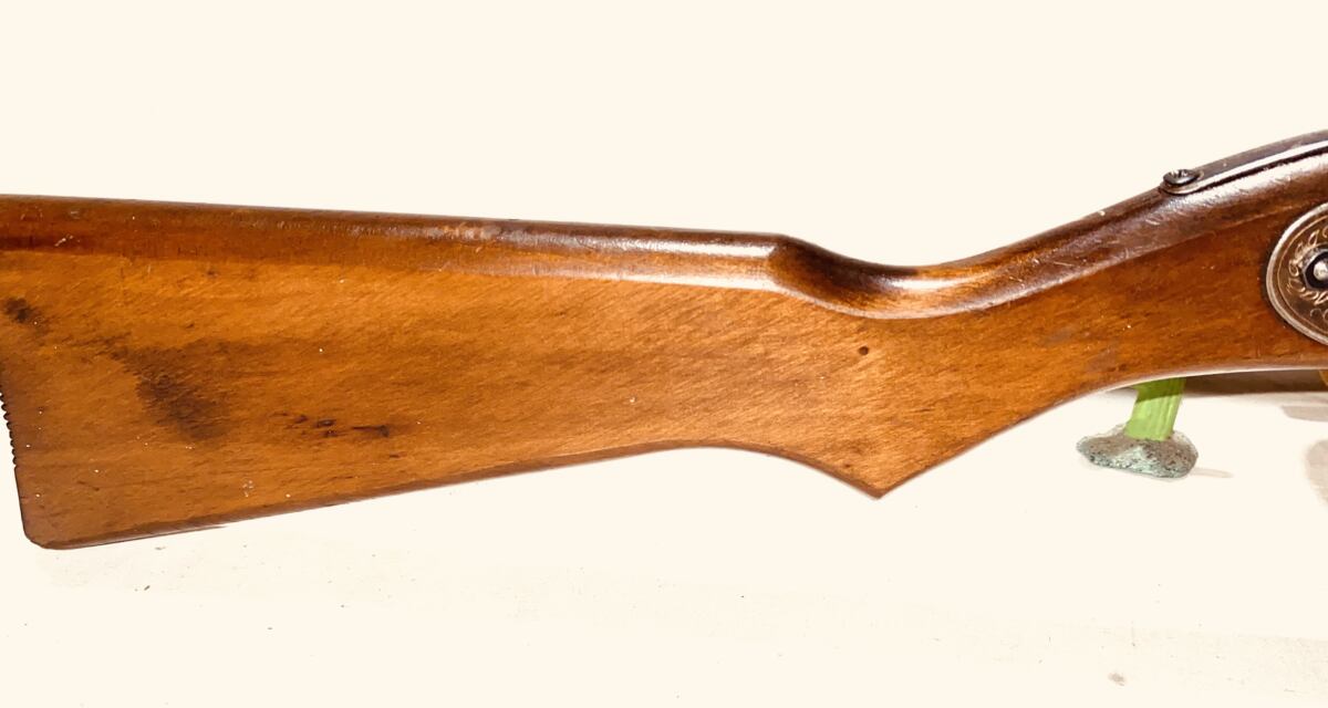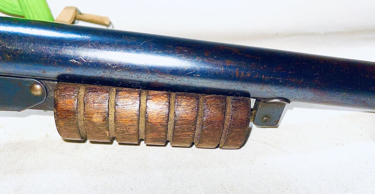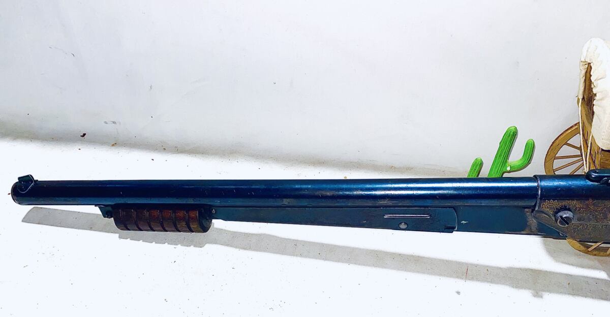 This is a model 25 produced in Plymouth Michigan from 1936 to 1942 and again in 1945 thru 1957 . Engraved Receiver gold paint filled from 1936 to 1942 down for WW11 four years back in 1945 thru 1957 . They started painting the finish in mid 1953 . This gun is not the painted finish . I estimate the date of this gun to be 1945 to early 1951 . This gun shoots strong the bluing is about 80 percent, long pump lever , non slip grooves on the butt of the wood stock , ended in 1951 . Nice gun collectible grade . The shipping on this gun would be $25