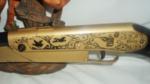 THIS IS A BEAUTIFUL DAISY MODEL 25 PUMP BB GUN WITH GOLD COLORING AND BLACK HARDWARE GIVES IT QUITE A STRIKING APPEARANCE . I CAN’T FIND ANY INFO IN THE BOOKS ABOUT THIS GUN BUT I WAS TOLD IT WAS MADE FOR MONTGOMERY WARDS IN THE EARLY 60’S . IT HAS THE MONTE CARLO STOCK . THIS GUN IS ABOUT 85%GOOD CONDITION . IT SHOOTS VERY STRONG . A VERY NICE GUN .