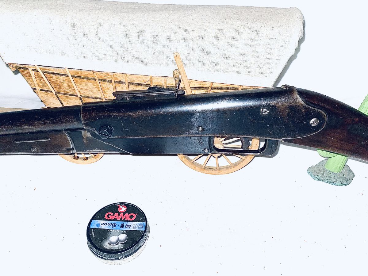 This Daisy model 25 with fixed front site , short stroke cocking lever, five groove variant 3 produced in Plymouth Michigan shortly after 1916 or 1917 produced sometime around WW1 actual date unknown . It has a fifty shot original shot tube lead bb’s . Gamo lead bb’s included. Approximately 85 percent of original bluing nice original walnut stock . The gun has been well taken care of shoots strong . Very collectible . There is the original owners initials carved in stock on right side near the butt but well done . The shipping on this gun would be $35