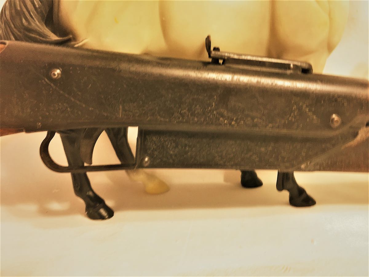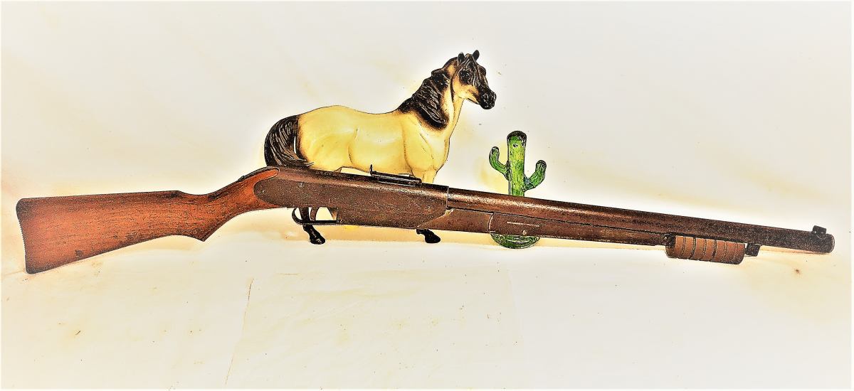 THIS IS A DAISY MODEL 25 PRODUCED AROUND 1936 IN PLYMOUTH MICHIGAN HAS A WOOD STOCK WITH PISTOL GRIP AND NON SLIP GROOVES ON BUTT ENGRAVED RECEIVER HAS BEEN BLUED BUT NOT MUCH LEFT ANYMORE . HAS BEEN RSEALED AND SHOOTS HARD NICE COLLECTIBLE GUN $ 20.00 SHIPPING IN LOWER 48