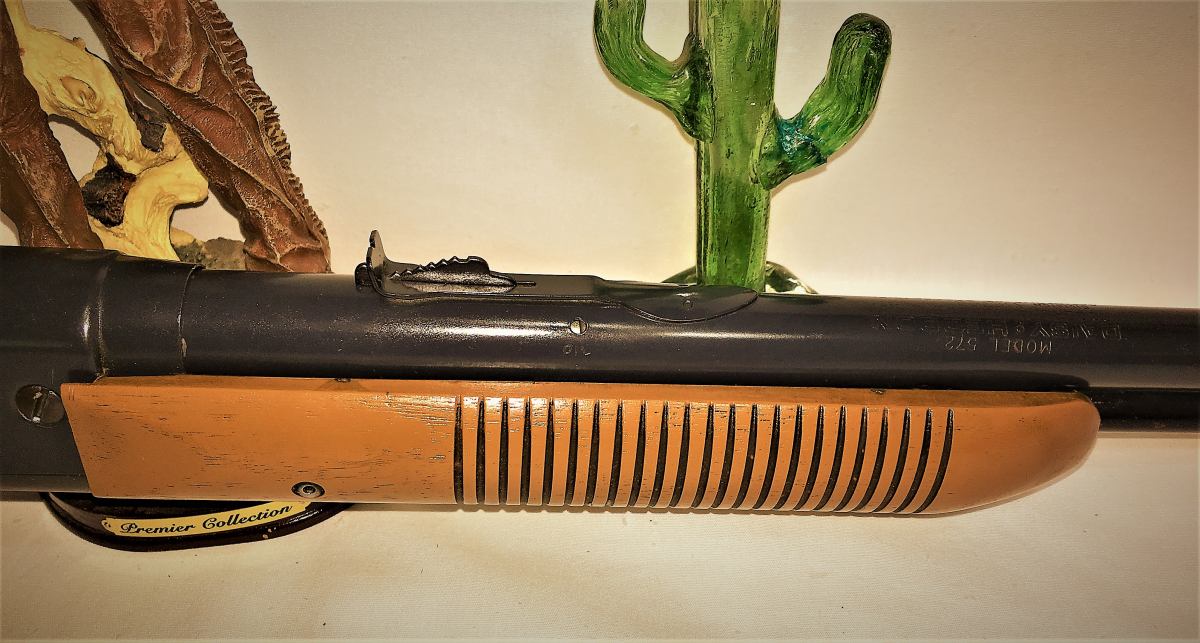 THIS IS A DAISY SPITTIN IMAGE OF THE REMINGTON FIELDMASTER 22 PUMP THIS IS A SLIDE ACTION PUMP 45 SHOT REPEATER WITH MOLDED STOCK AND FORE ARM , PAINTED FINISH . THIS MODEL 572 WAS PRODUCED 1967 THRU 1971 . I’AM NOT FOR SURE WHY THEY CHANGED FROM THE MODEL 26 TO THE 572 I THINK IT WAS BECAUSE SOME REDESIGNING IN THE PUMP ACTION THE OLD 26 WOULD BREAK VERY EASY WHEN SHOT WITHOUT BB’S IN IT THE RACHETT SECTION WOULD BREAK UNDER THE PRESSURE BECAUSE IT WAS PLASTIC . THIS IS A RARE GUN IN GOOD CONDITION I ESTIMATE THIS TO BE 95% . THE GUN HAS BEEN RESEALED AND SHOOTS STRONG . IT IS RARE IN THIS CONDITION AND COLLECTIBLE .