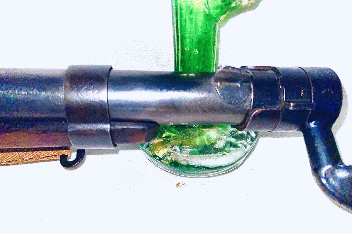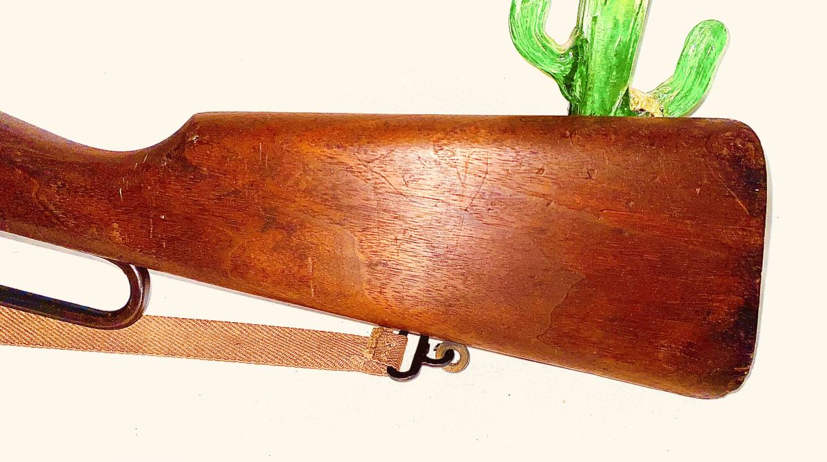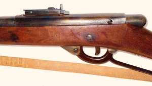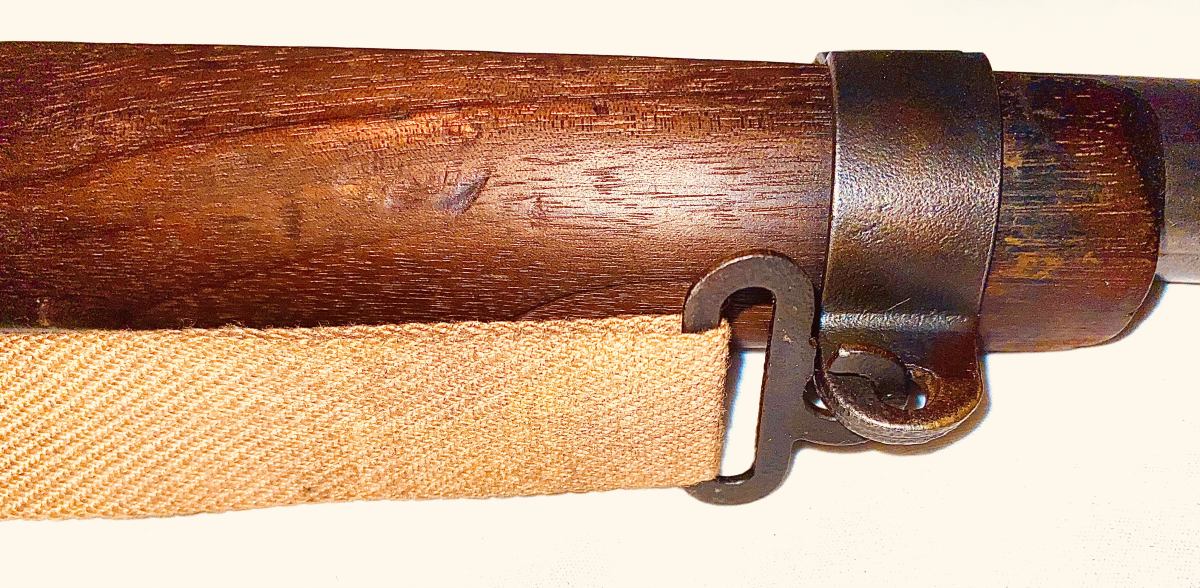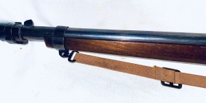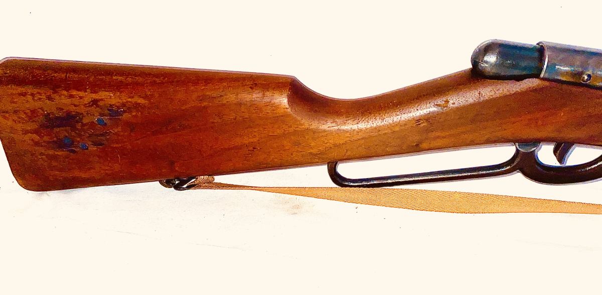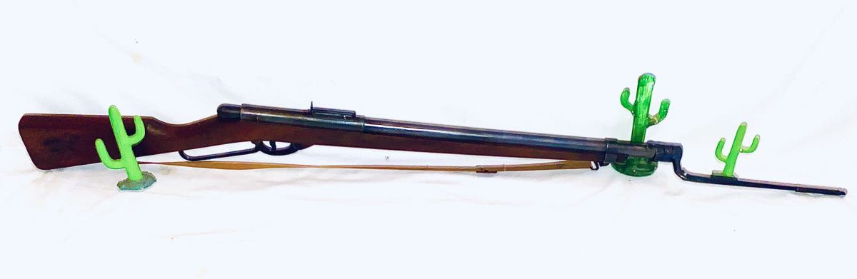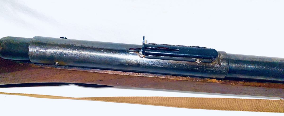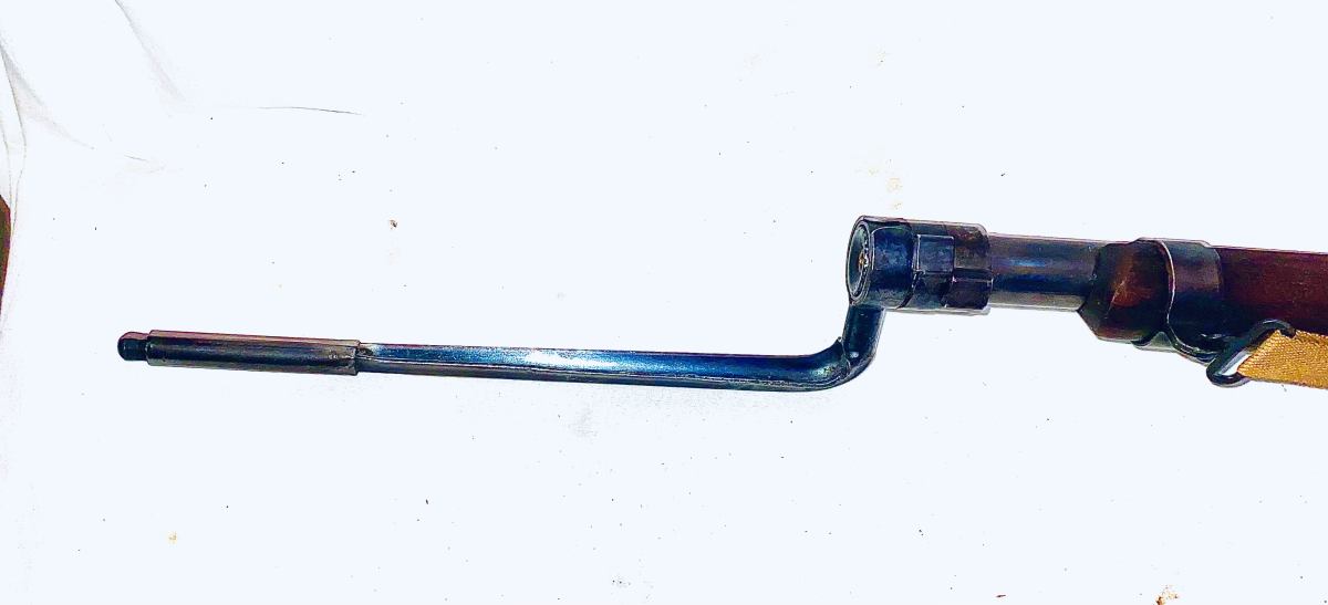 This Daisy model 40 military is the variant 2 fixed front site, standard model 25 shot tube . Produced from 1919 thru 1932 in Plymouth Michigan. Original bayonet that had been shortened approximately an inch and a half for what reason is unknown . Speculation is that it was shortened when sharpened but has been replaced with a piece of tubing to the right length as shown in the picture. This gun has been resealed with leather seals . Shoots strong. Has been reblued, the ruff old finish on the stock has been removed and stock has been treated with lemon oil . It looks as tho it has the original sling and hanging brackets . This is a nice gun even tho it had some restoration work . It is extremely rare to find one with the original bayonet in any condition collectible . The shipping on this gun would be $40