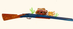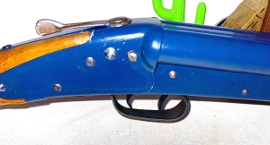 This is a Daisy model 410 pop gun looks like the model 21 spittin image Winchester double barrel produced in Rogers Arkansas in 1968 thru 1972 . This gun has been resealed so it has a very loud pop . It also has been restored with new paint. It has the Daisy reinforced stock that they reproduced the last year and a half of the total run because the original stock apparently had been broken.Which was very common on the models 410 & 21 . This pop gun will blow the right size cork 30 ‘ or more with gusto . This is one of the rarest full size Double barrels that Daisy produced other than the salesman sample which also is a pop gun and I have one of those also but not listed . Merry Christmas and happy New Year . The shipping on this gun would be $45