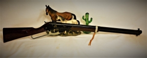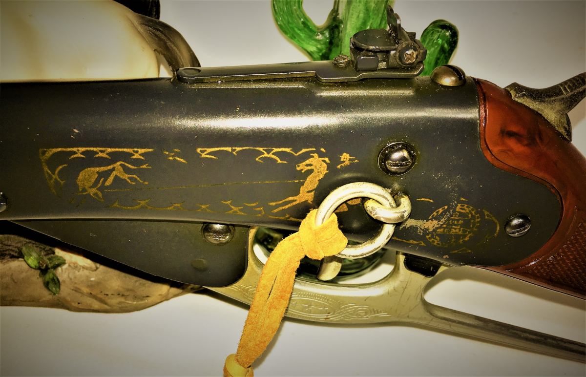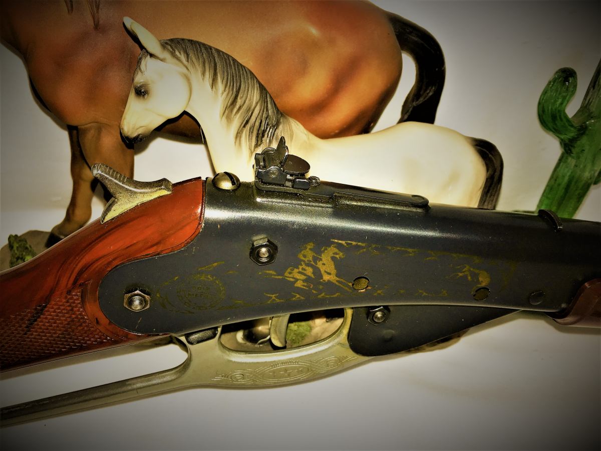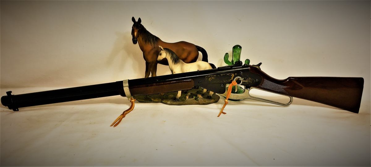 THIS IS A DAISY MODEL 94 WESTERN CARBINE MADE BETWEEN 1958 THRU 1961 IN ROGERS ARKANSAS IT IS 850 SHOT , MOLDED STOCK AND FORE GRIP , THERE IS A SMALL AMOUNT OF WARP IN THE STOCK WHICH IS COMMON BUT THERE IS NO WARP IN THE FORE GRIP . PAINTED FINISH GOLD SILK SCREEN OF COWBOY ROPING A STEER THE GRAPICS ARE STILL FAIR SILVER FORE GRIP BAND WITH NATIVE AMERICAN GRAPICS AND LEATHER THONGĀ .IT SHOOTS GOOD . THIS GUN SHOWS VERY LITTLE PLAY TIME .