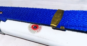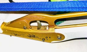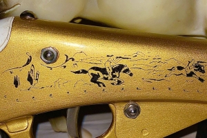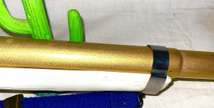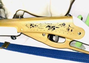 This toy Annie Oakley pop and smoke rifle has been restored new gold paint, new graphics, clear coat over all. Stock is in near perfect condition, foregrip was badly warped and has been straightened all hardware and foregrip band has been newly buffed up to a high gloss . New blue strap has been added along with new anchor eyelet . Nice gun now and collectible. The shipping would be $25
