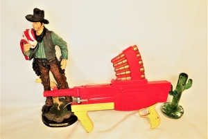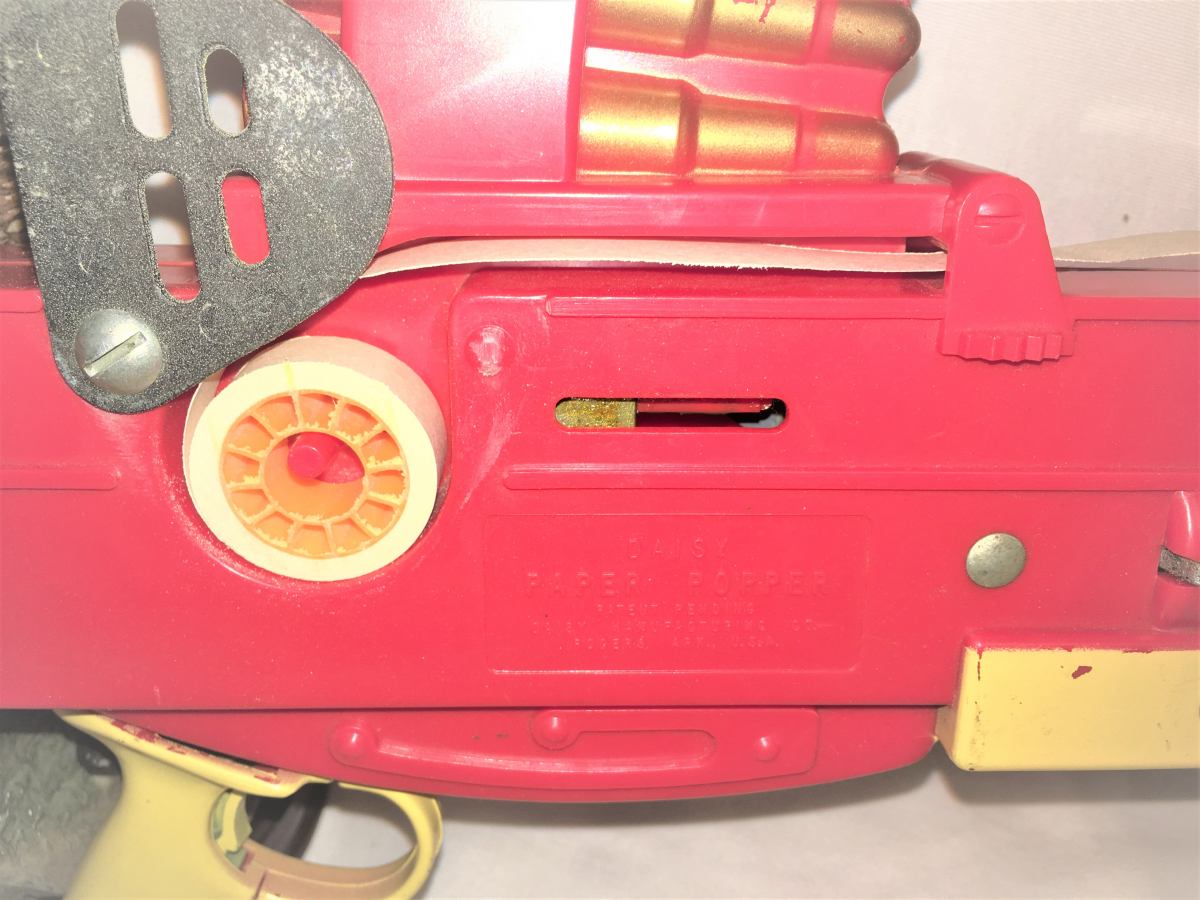 THIS IS A DAISY TOY THAT USES PAPER THAT MAKES A POPPING SOUND WHEN THE MECHANISM IS MOVED BACK AND FORTH AS FAR AS I KNOW THERE IS NOT ANY DAISY PAPER TO PUT IN THIS PAPER GUN SO I TOOK A ROLL OF CALCULATOR PAPER AND CUT IT DOWN TO THE RIGHT WIDTH ON MY BAND SAW AND IT WORKED OUT WELL . VERY NICE TOY VERY LITTLE PLAYTIME ON THIS GUN . COLLECTIBLE .