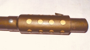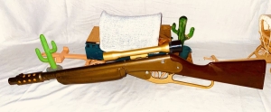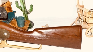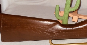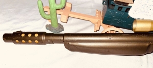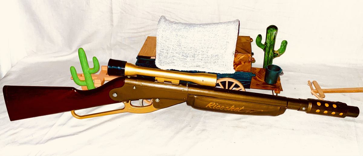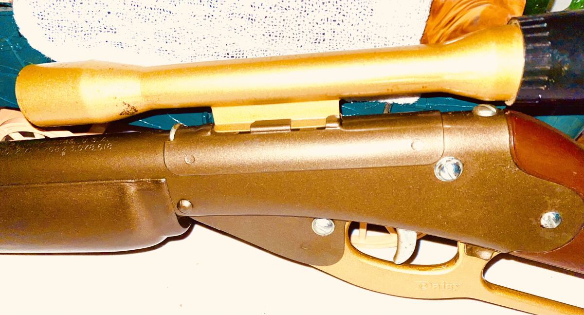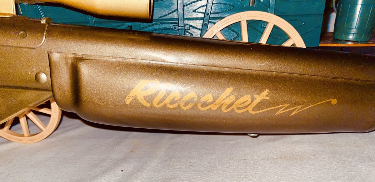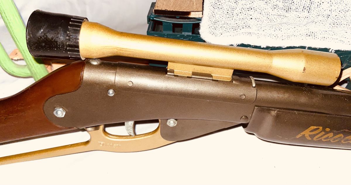 This pop gun was produced by Daisy in Rogers Arkansas from mid 1960’s to the early 70’s . Before the law required a red plug on the end of the muzzle which was supposed to show it was a toy . This gun is about 90 percent thru out . It has the dark bronze gold paint . On the right side of the metal foregrip in script says Ricochet in light gold paint . Notice how it looks at the muzzle end . This gun has a peep sight scope in light gold color. Shows very little playtime and is rare . Very collectible . The shipping on this would be $30