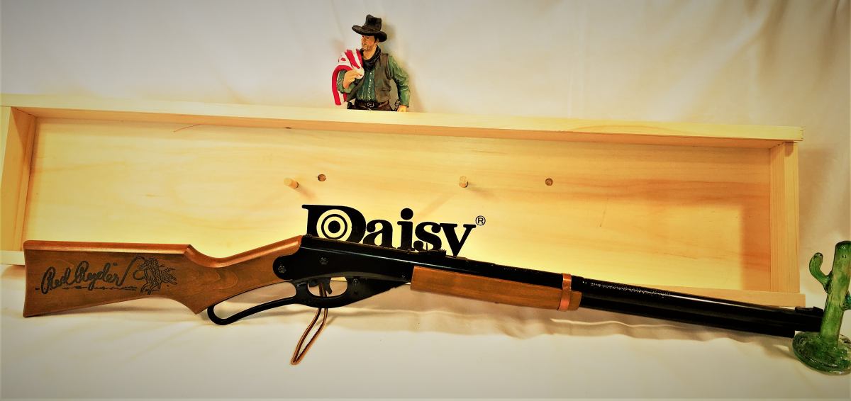THIS IS A DAISY 35TH ANNIVERSARY RED RYDER CHRISTMAS DREAM . NEW WITH THE BOX AND PAPER WORK . THE DISPLAY CABINET IS PRODUCED BY DAISY IT CAN BE MOUNTED ON THE WALL OR DISPLAYED LAYING DOWN . IT HAS A SLIDE IN PLEXIGLASS LID . IT IS MADE OF WHITE PINE WITH GLUED LOCKED JOINTS . VERY NICE FOR DISPLAYING THE GUN . IF YOU DESIRE TO HAVE JUST A DISPLAY CABINET CONTACT ME . THEY ARE $100 PLUS SHIPPING .