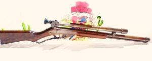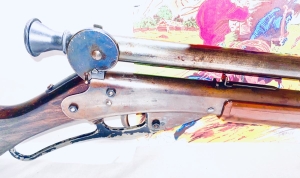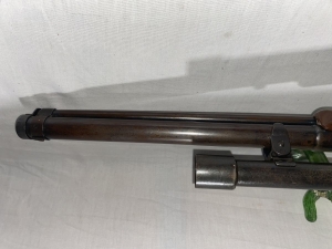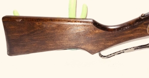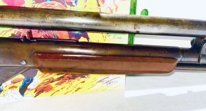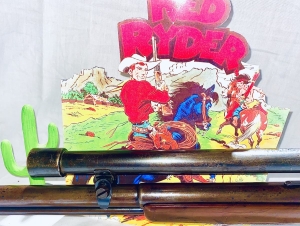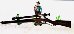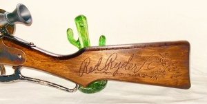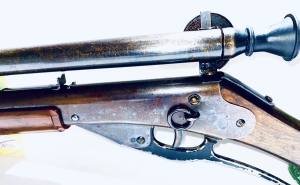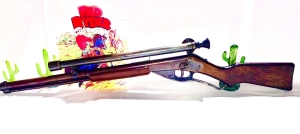 This is a Daisy red Ryder variant 6 produced in Plymouth Michigan in 1950 & 1951 only. You will notice this model 111 model 40 red Ryder variant 6 has a wood stock but a plastic forearm , aluminum cocking lever, fixed sights . The 300 scope was an add on it has a look a like repo rubber eyepiece. The originals became hard and cracked and most of the time fell off . This gun still has a lot of the original bluing. The stock has been over sprayed with a clear coat . Nice collectible gun shoots strong . The shipping on this gun would be $35 .