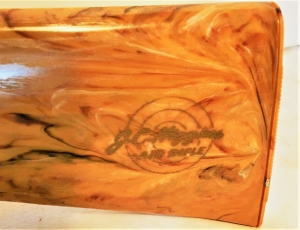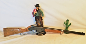THIS IS A DAISY SEARS & ROEBUCK J C HIGGINS BB GUN PLAYED WITH VERY LITTLE WITH GOOD GRAPHICS AND SHOOTS STRONG . THE STOCK AND FOREGRIP ARE THE RARE CARMEL COLOR . IT HAS A SLIGHT WARP IN THE STOCK NORMAL FOR THE COMPOSITE GUNS . THIS GUN WAS PRODUCED AROUND 1960 FOR SEARS . NICE LITTLE COLLECTIBLE . THE SHIPING ON THIS GUN WOULD BE $15 IN THE LOWER 48