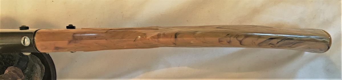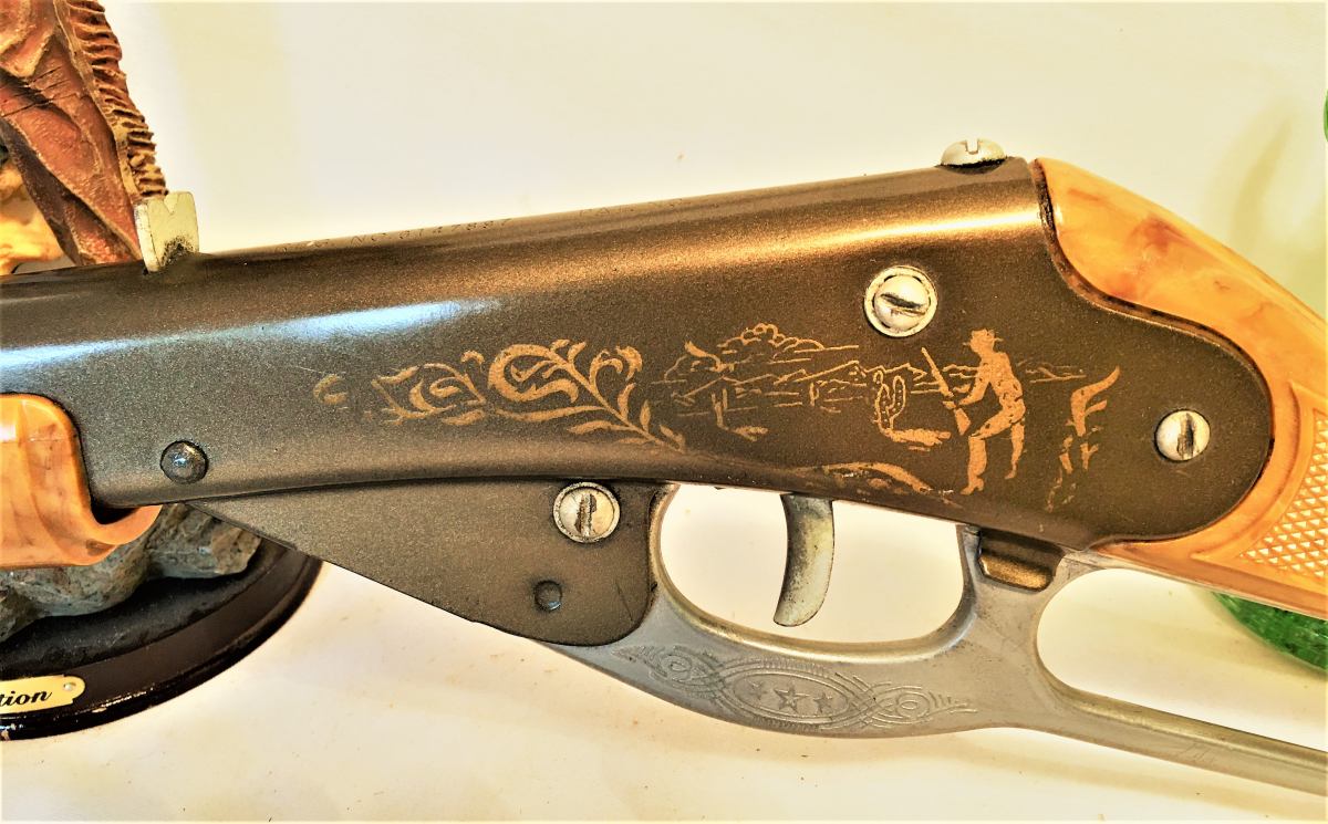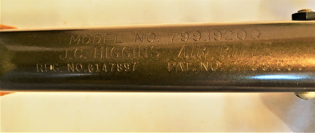 THIS IS A DAISY SEARS & ROEBUCK J C HIGGINS BB GUN PLAYED WITH VERY LITTLE WITH GOOD GRAPHICS AND SHOOTS STRONG . THE STOCK AND FOREGRIP ARE THE RARE CARMEL COLOR . IT HAS A SLIGHT WARP IN THE STOCK NORMAL FOR THE COMPOSITE GUNS . THIS GUN WAS PRODUCED AROUND 1960 FOR SEARS . NICE LITTLE COLLECTIBLE . THE SHIPING ON THIS GUN WOULD BE $15 IN THE LOWER 48