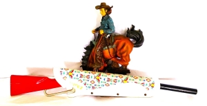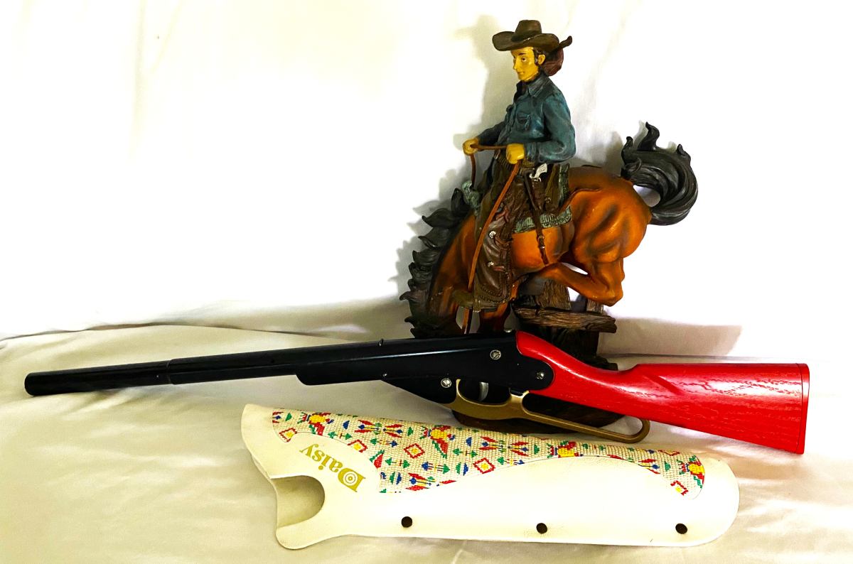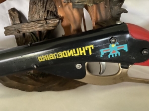 THIS DAISY MODEL 1011 THUNDERBIRD POP GUN DOES SHOW SOME PLAYTIME BUT NO ABUSE . THIS IS NATIVE AMERICAN MOTIF . IT WAS PRODUCED IN ROGERS ARKANSAS EARLY 60’S . COMES WITH THE WHITE BOOT DECORATED WITH INDIAN GRAPHICS IN GOOD CONDITION . THESE POP GUNS ARE VERY HARD TO FIND THEY WERE PLAYED WITH HARD AND MANY WERE ABUSED THRU PLAYTIME AND SEPARATED FROM THE BOOT AND LOST . VERY NICE COLLECTIBLE . I HAVE ONLY SEEN TWO OF THESE OVER THE YEARS IN THIS CONDITION . THE SHIPPING ON THIS GUN WOULD BE $25