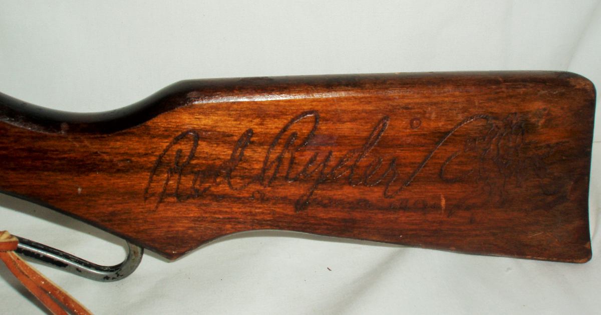 THIS RED RYDER BB GUN WAS PRODUCED FROM 1947 TO 1952 FOR FIVE YEARS . IT HAS A WOOD STOCK, PLASTIC FOREARM ,BLACK PAINTED CAST ALUMINUM LEVER , FIXED SIGHTS , METAL HAS BEEN BLUED FROM FACTORY WITH SOME TOUCHUP . THIS GUN IS ABOUT 70 % . IT SHOOTS STRONG .NEW LEATHER ON SADDLE RING . THE PLASTIC FOREARMS ON THESE GUNS HAD A TENDENCY TO WARP BUT THIS ONE HAS VERY LITTLE WARP IN IT . YOU MUST BE 18 YRS. OF AGE TO PURCHASE ANY BB GUN.