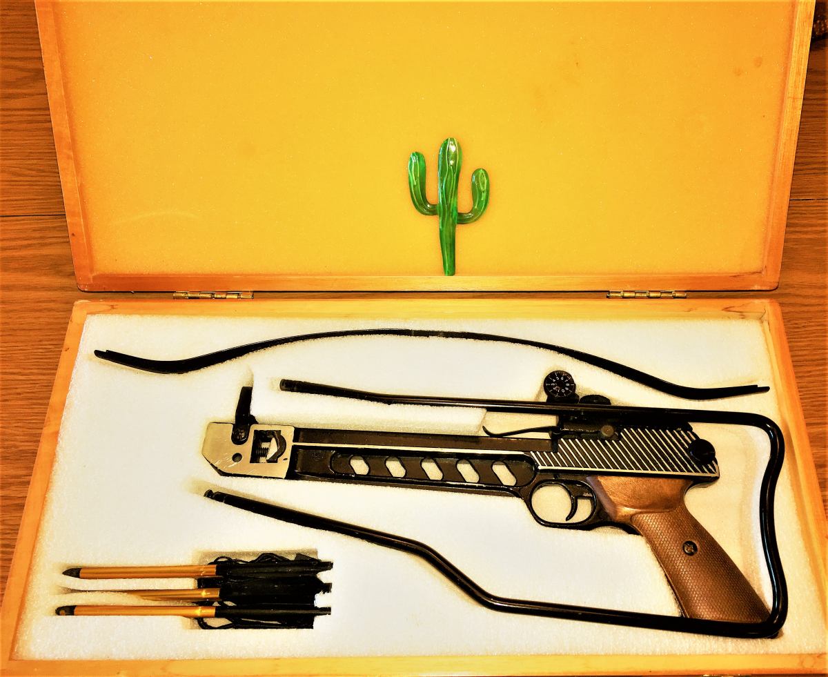 THIS CROSS BOW IS ALL METAL WITH THE EXCEPTION OF A FEW PLASTIC PARTS . IT IS A PISTOL GRIP OR A BOLT ON HEAVY STEEL WIRE STOCK . COMES WITH ( 5 ) ARROWS . THIS CROSS BOW HAS A SPRING STEEL BOW THAT IS VERY POWERFUL . THIS CROSS BOW HAS BEEN USED VERY LITTLE COMES PACKED IN ITS WOODEN CARRY BOX . GOOD FOR TARGETS OR SMALL GAME . THE SHIPPING ON THIS WOULD BE $25 IN THE LOWER 48 .