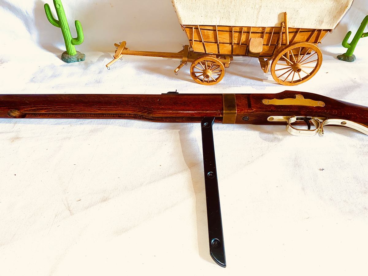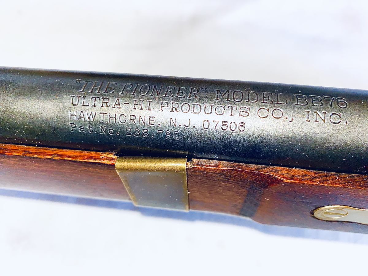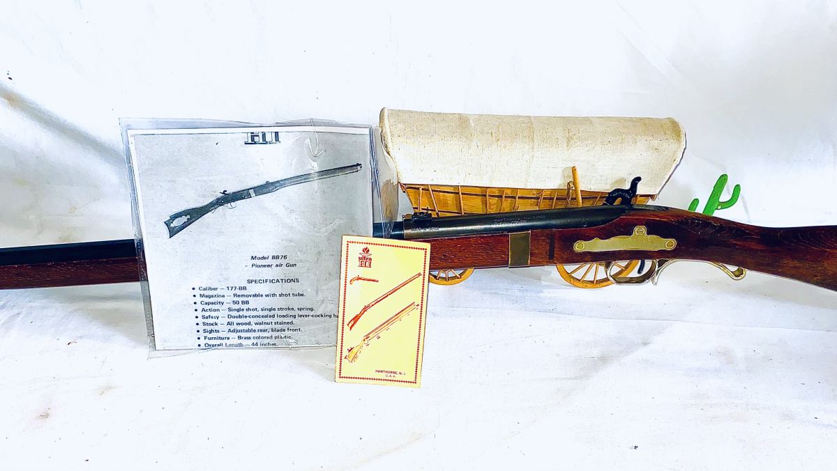 This Pioneer model 76BB gun was produced for our bicentennial in 1976 for about a year and a half or so . It does show some playtime after nearly 50 years . We did reseal it and it shoots strong . The gun has nice wood and under foregrip cocking lever . The hammer assembly is actually the safety it goes forward when it is cocked and pull the hammer back to shoot it the magazine shot tube holds appropriately 45 bb’s it has to be unscrewed and removed to reload it . It is spring fed . Gold colored plastic trim . The box is fair . The paper work is mostly reprinted the little tan folder is original. All the features are plainly printed on the box as seen . These guns are very collectible.The shipping on this gun would be $50